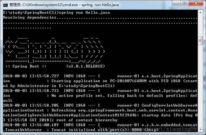 SpringBoot CLI 在这时会构建并启动程序,启动完成后,访问 http://127.0.0.1:8080/hello